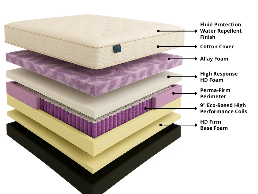 Advanced Allay Pressure-Relieving Memory Foam gently cushions shoulders and hips, evenly distributing weight to reduce pressure points and promote deeper, more comfortable sleep throughout the night.